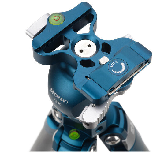The FS30 Ball Head from Benro boasts an inverted design capable of handling cameras up to 10 lb with ease. It includes a top plate that offers smooth panoramic rotation and an integrated Arca-type quick release set. The quick release clamp features a locking lever for rapid plate changes. Additionally, a built-in bubble level ensures easy and precise leveling for every shot.