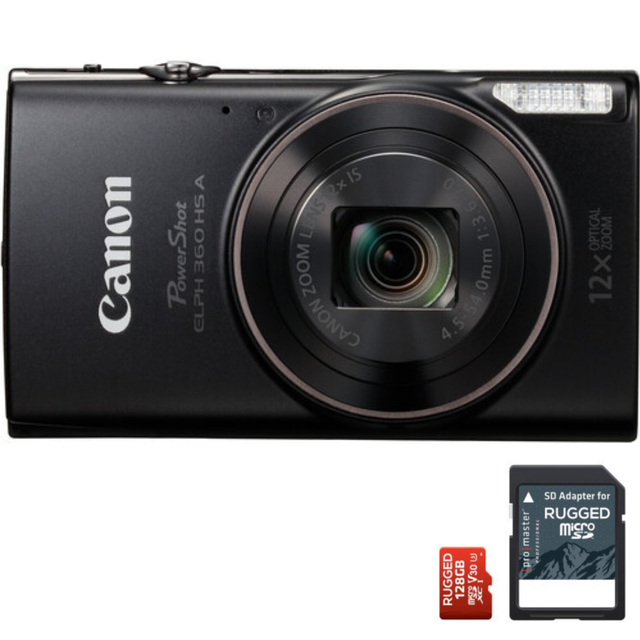 Canon PowerShot ELPH 360 HS A Digital Camera (Black) with Promaster Micro SDXC 128GB Rugged