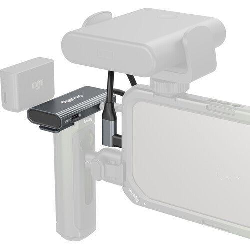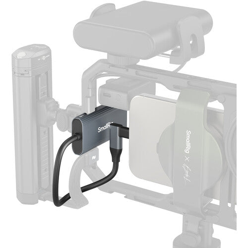 The SmallRig 4-in-1 USB-C Hub is a compact, versatile accessory for professional smartphone video production. Its USB-C 3.2 Gen 2 port delivers data transfer speeds up to 10 Gb/s, ideal for recording ProRes video at 4K/60p to SSDs, while two USB-C 2.0 interfaces accommodate microphones or earphones. A USB-C PD port supports fast charging up to 100W with a separately available power adapter, and the integrated USB-C cable ensures seamless connectivity with your device. Designed for convenience, the hub includes a built-in cold shoe clamp for secure mounting on a cold shoe or other gear. Note that when using an SSD, an external power source must connect to the USB-C PD port, as smartphones cannot power both the hub and SSD simultaneously. This hub transforms a single USB-C port into a multi-functional solution for charging, data transfer, and audio/video needs, with rapid charging, fast data transfers, and easy mounting options. |